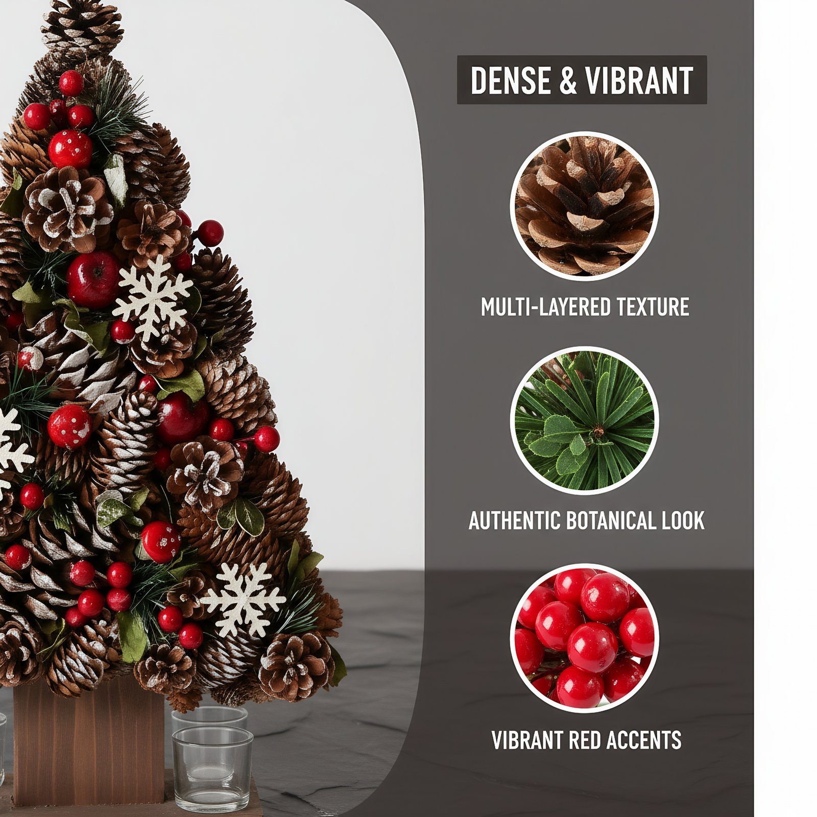 Kaige Natural Pine Cone Decorative Christmas Tree with Snowflakes, Berries, and Wooden Dual Tea Light Holder Base, Festive Table Centerpiece