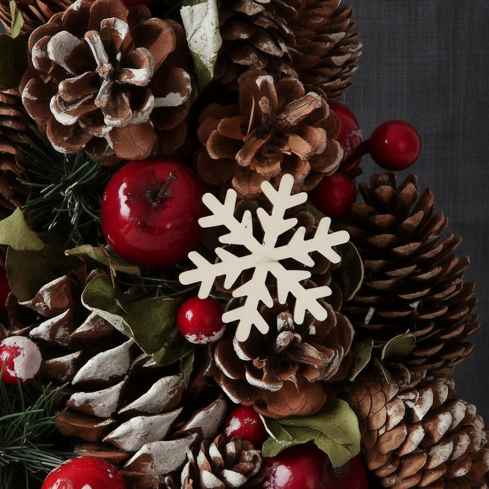 • Rich Festive Accents: The tree is adorned with vibrant red berries and decorative white snowflake cutouts, creating a strong, cozy winter holiday atmosphere.